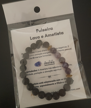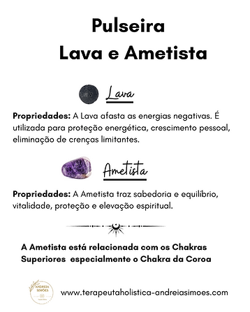 A lava afasta as energias negativas. É utilizada para protecção energética, crescimento pessoal, eliminação de crenças limitantes. A ametista traz sabedoria e equilíbrio, vitalidade, protecção e elevação espiritual. A Ametista está relacionada com os Chakras Superiores especialmente o Chakra da Coroa.